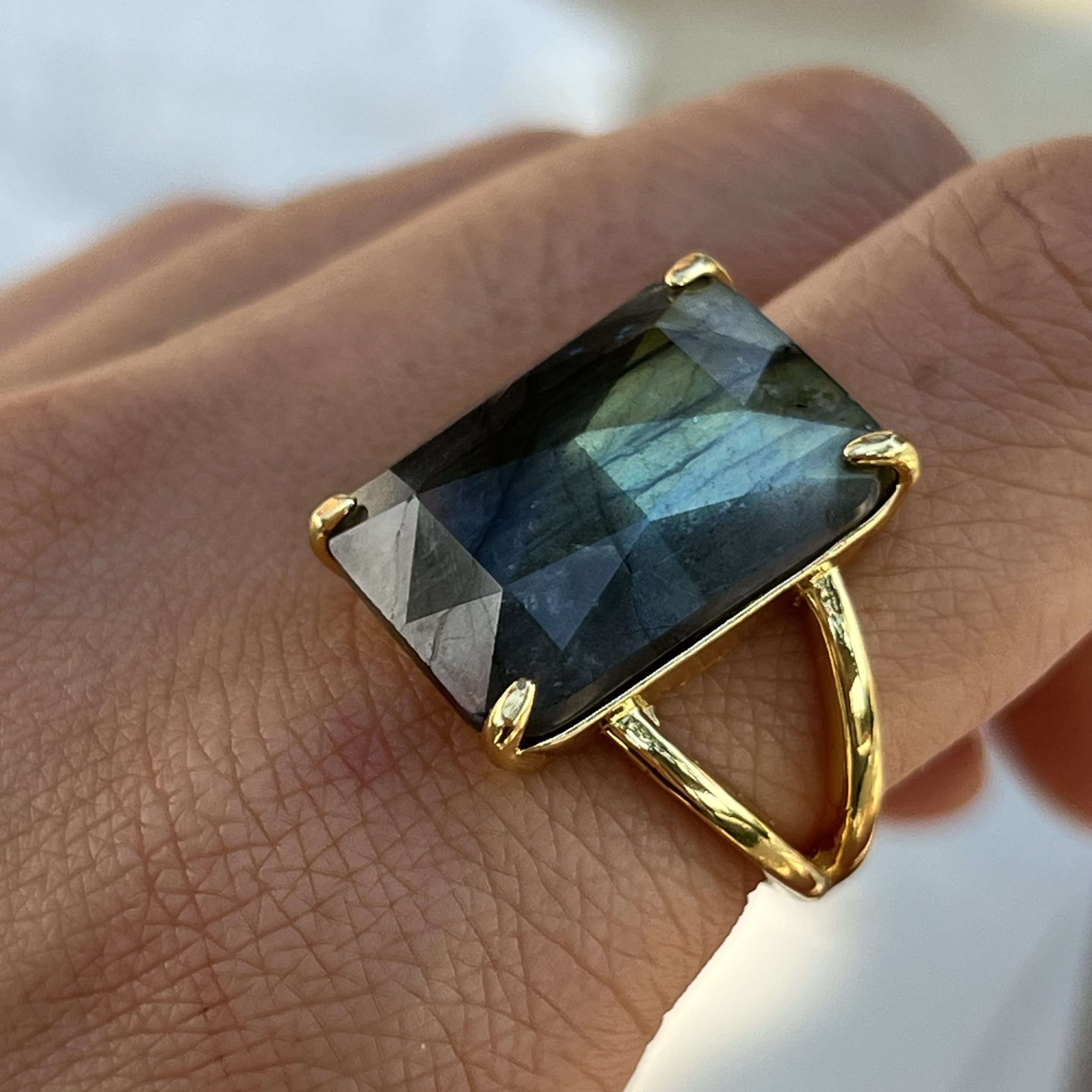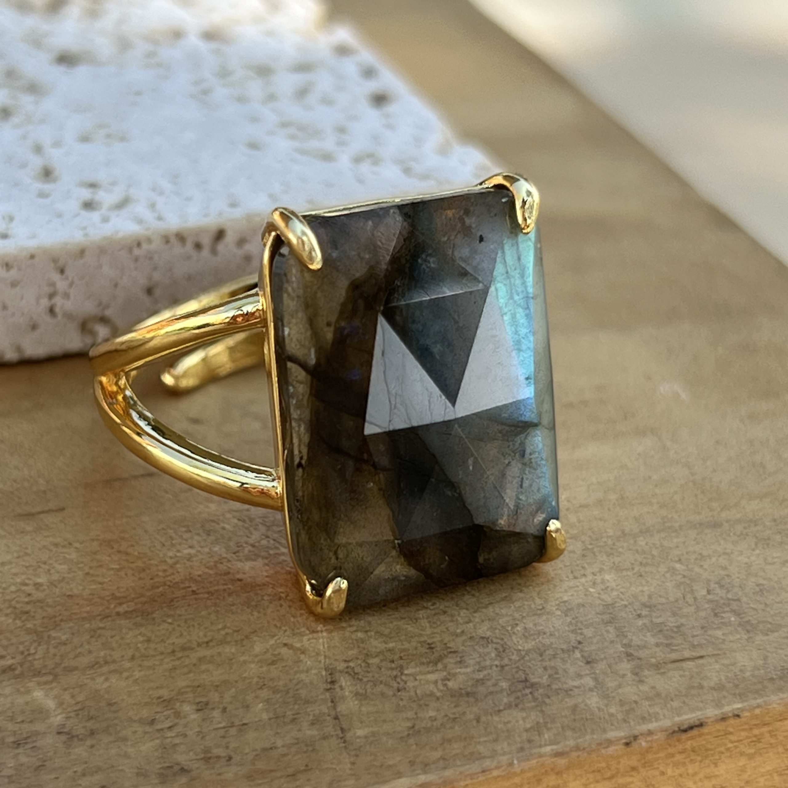 La labradorita es conocida por asociarse con la intuición y la transformación. En este anillo sus destellos cambiantes aportan carácter y profundidad.