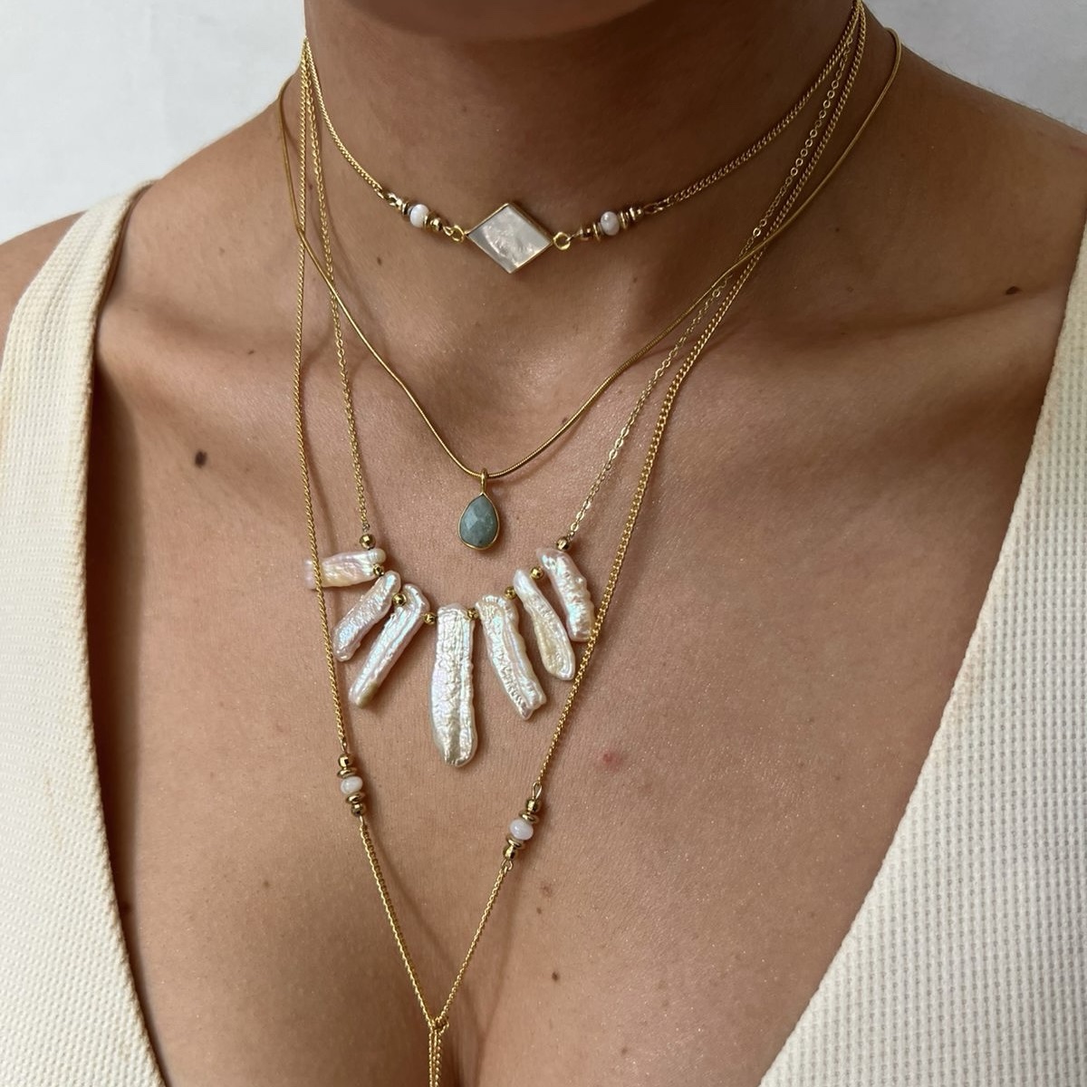 Madre perla, Amazonita y Perla de rio cultivada.