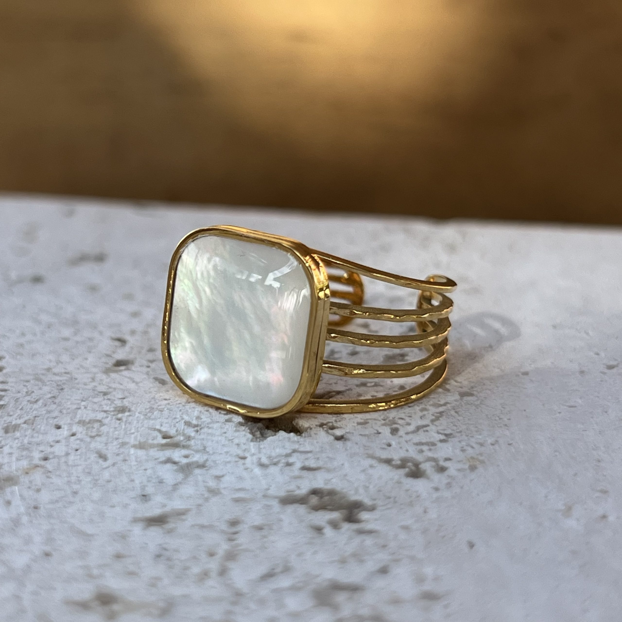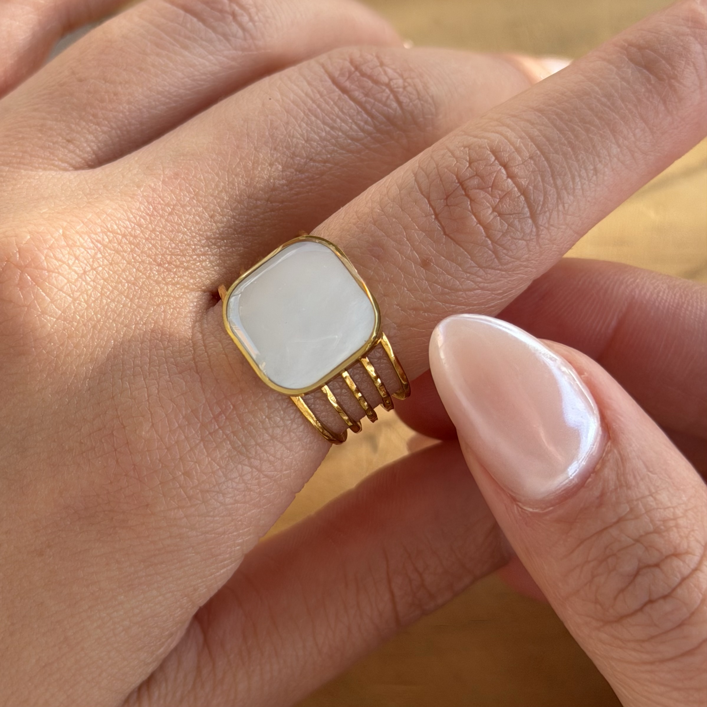 La madre perla se asocia con la calma y la armonía. Su brillo suave aporta luz y equilibrio en una pieza limpia, versátil y de elegancia sutil.