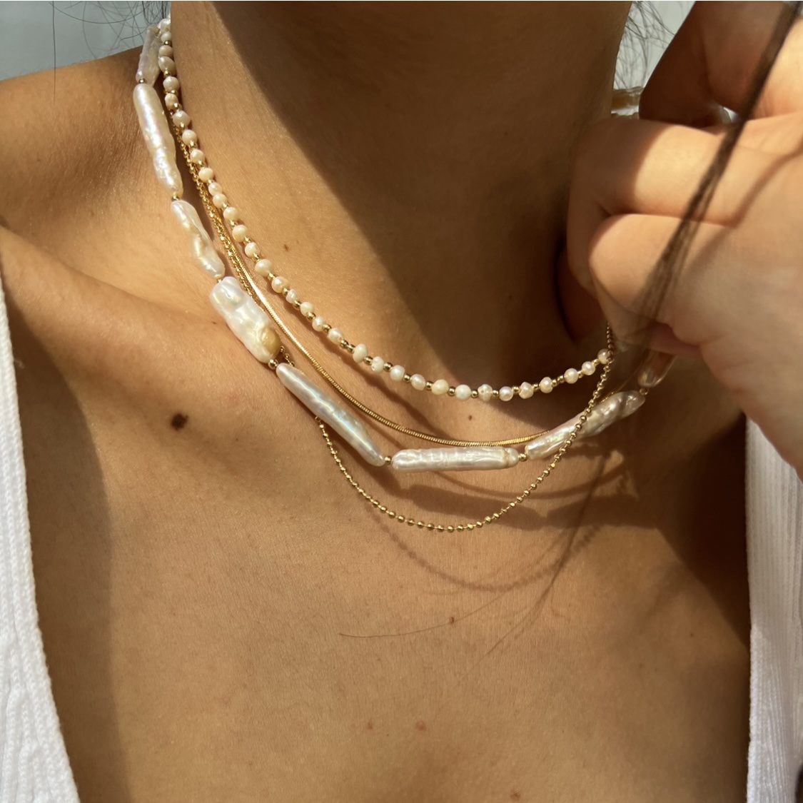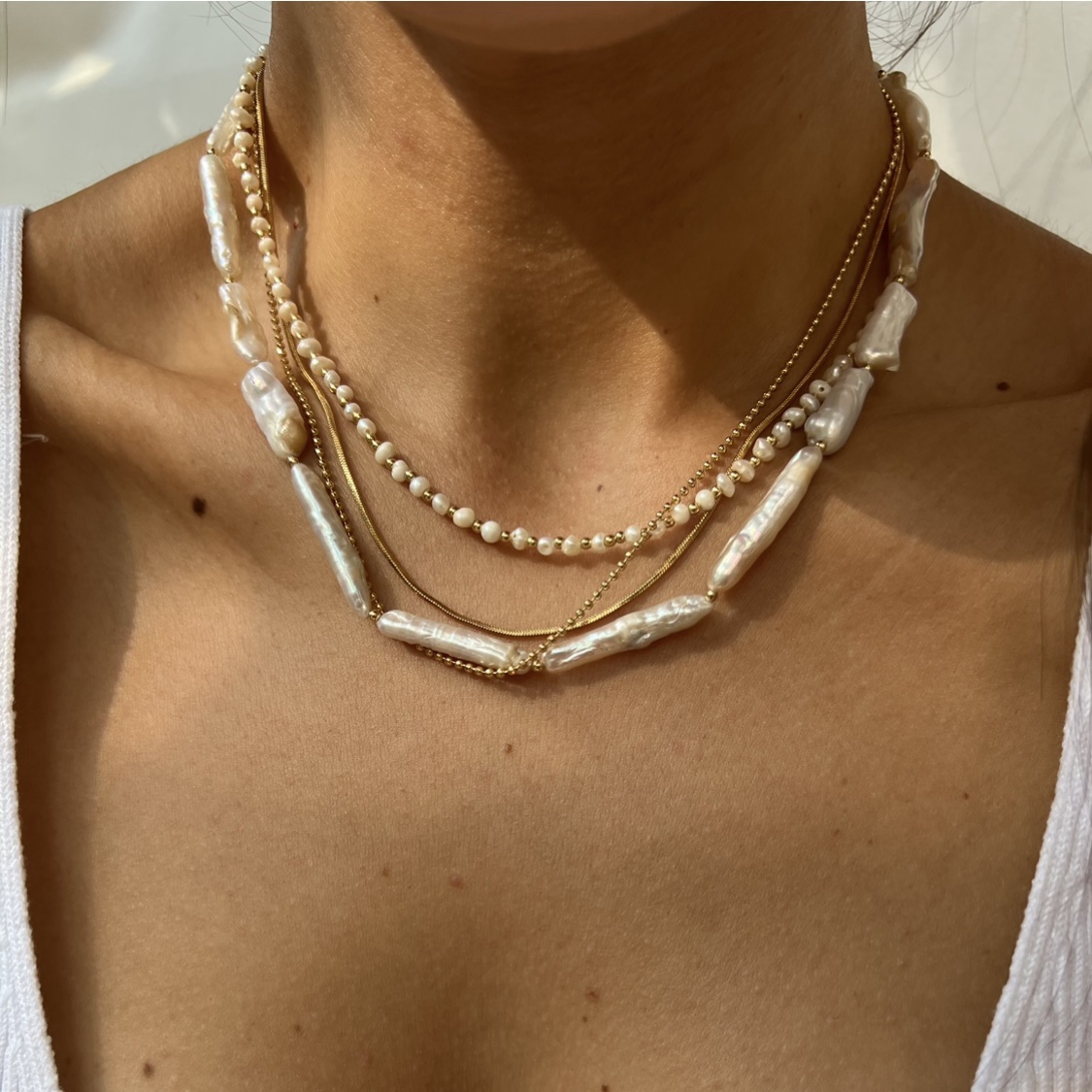 Layering de perla cultivada. Cadenas en chapa de oro de 18k. Largo 45 cm mas 5 de extensión.